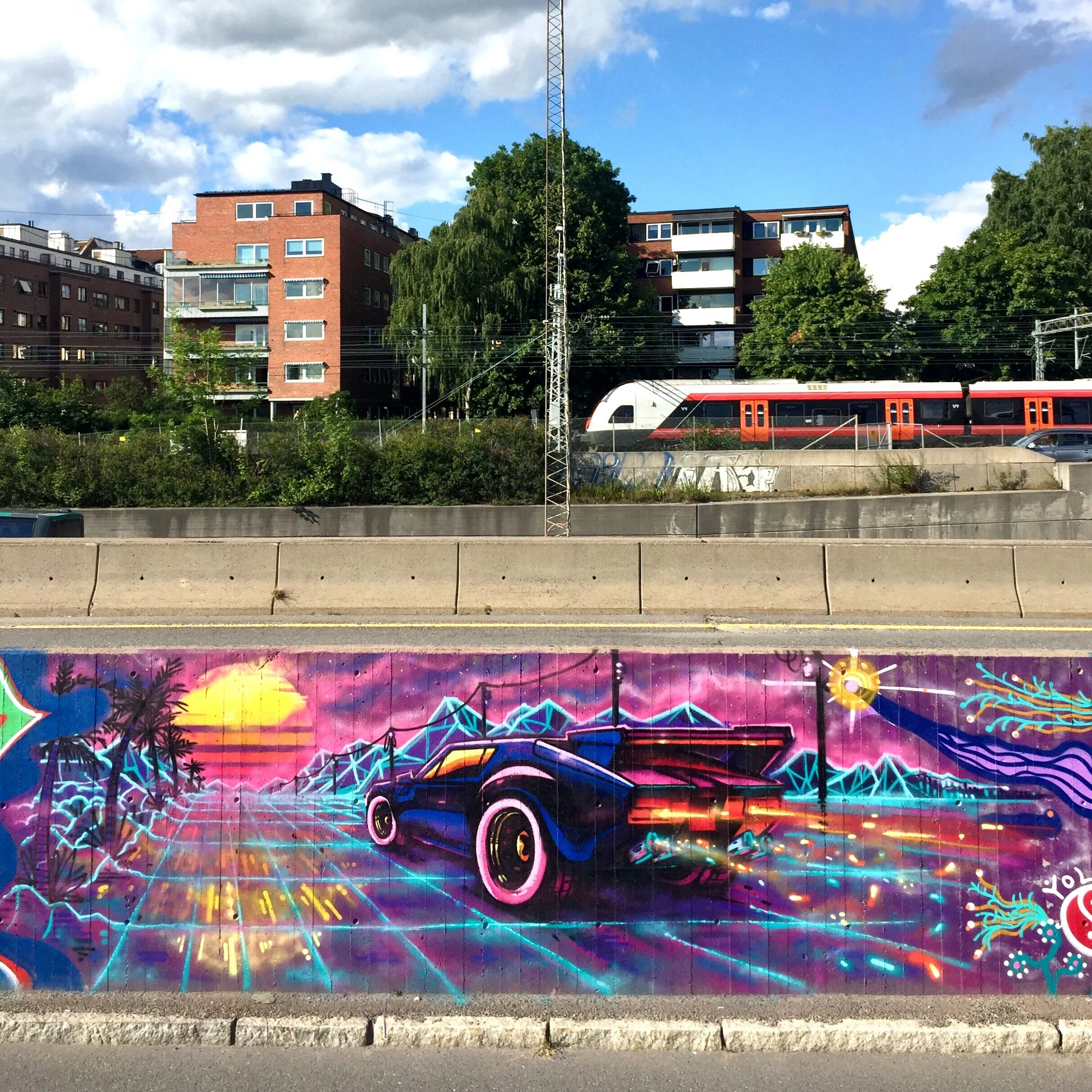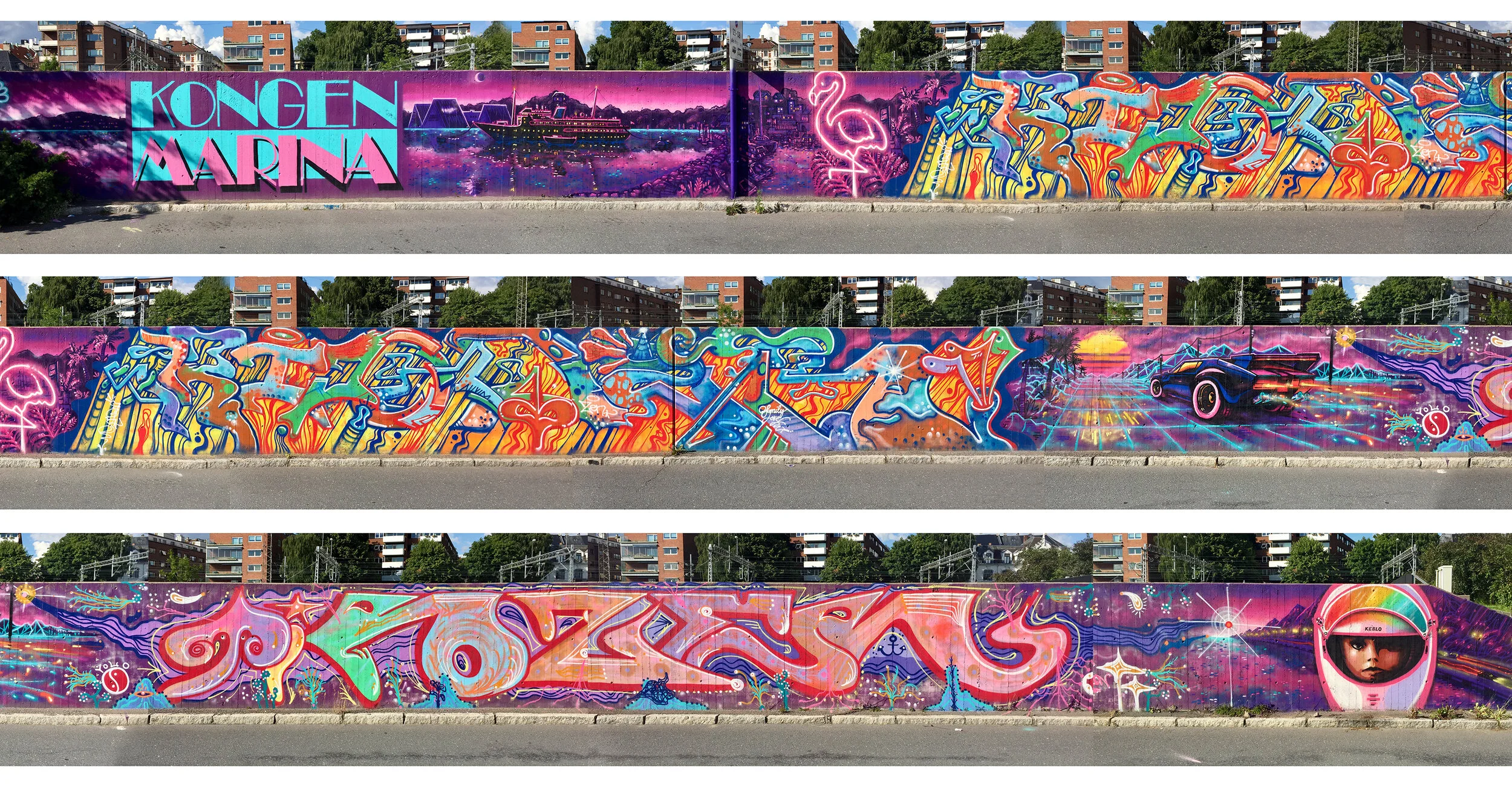 This mural is painted on a concrete wall facing the Fjord of Oslo.